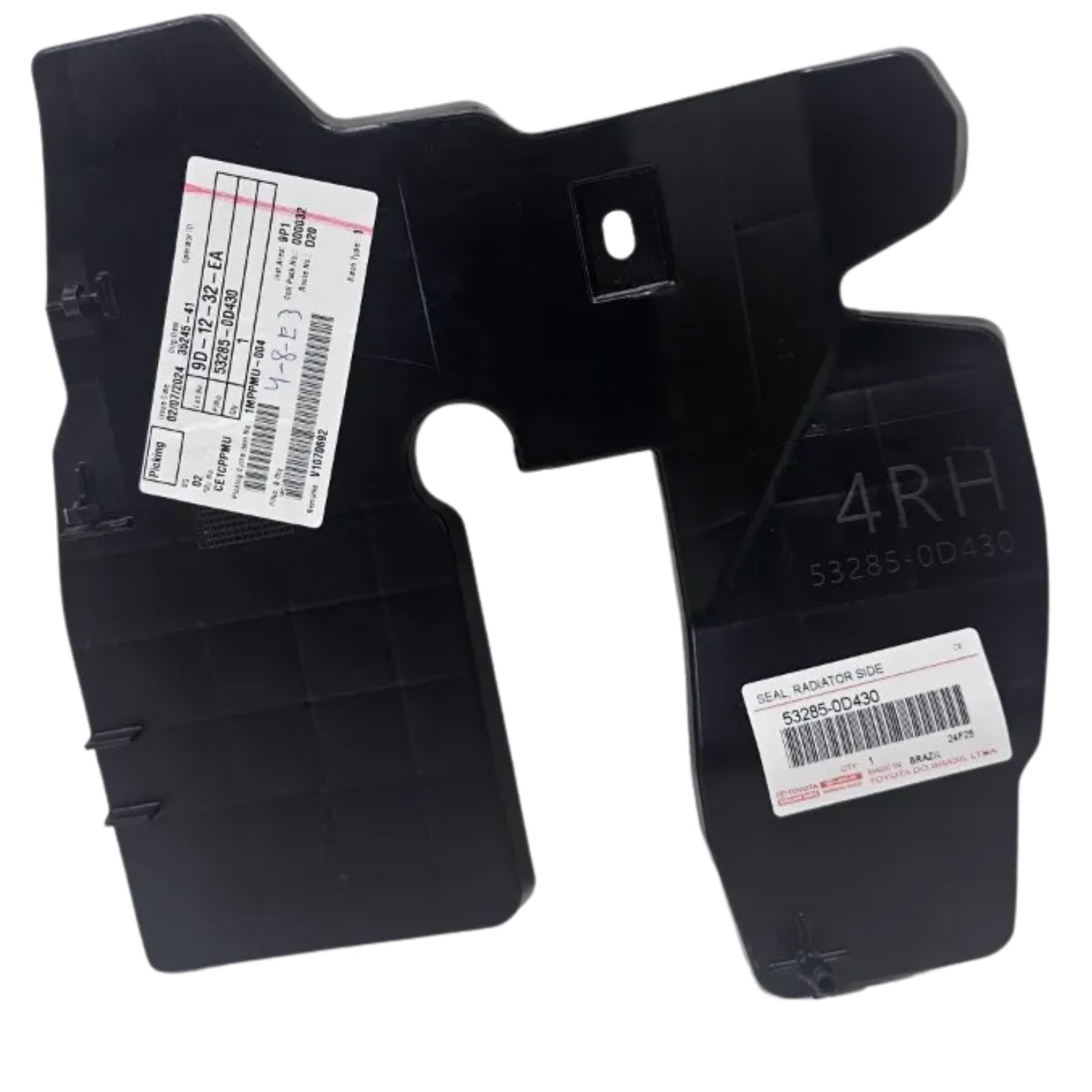 Defletor Radiador Lado Dir Yaris 2019/22 – cód. 532850D430 é uma peça plástica de acabamento e direcionamento de fluxo de ar para o sistema de arrefecimento do veículo.